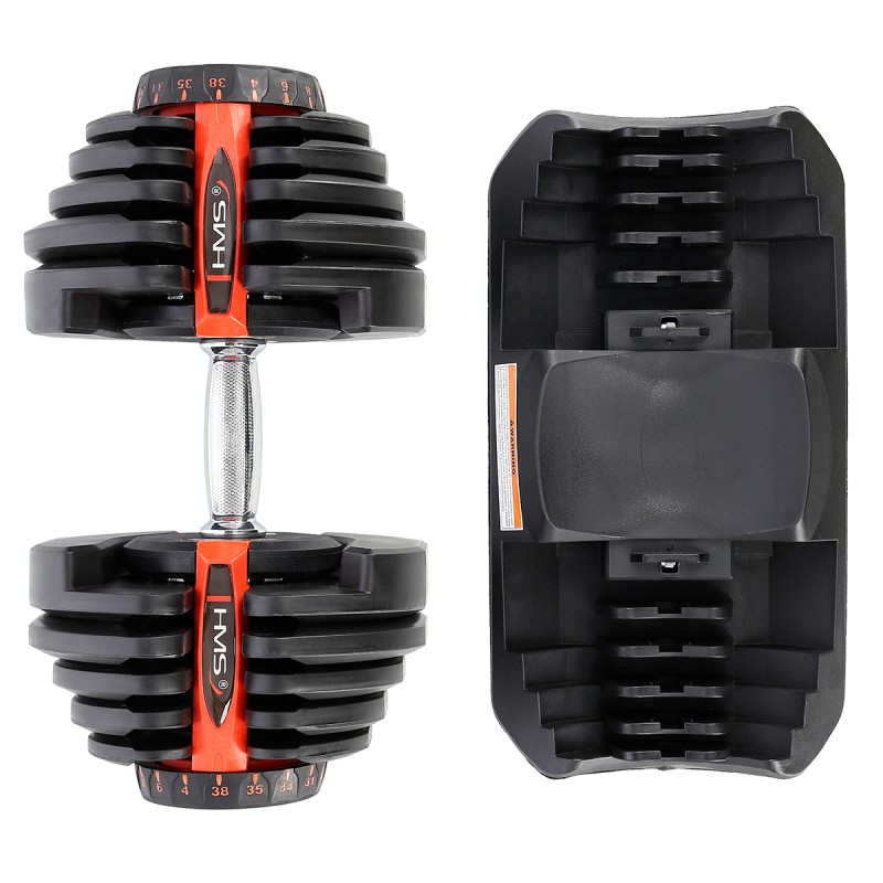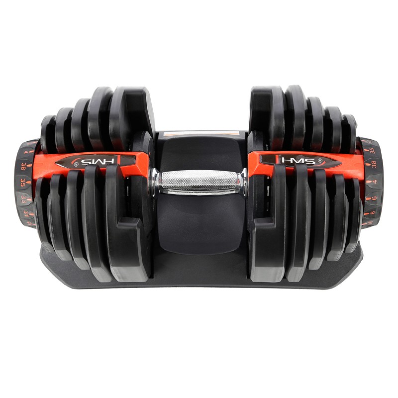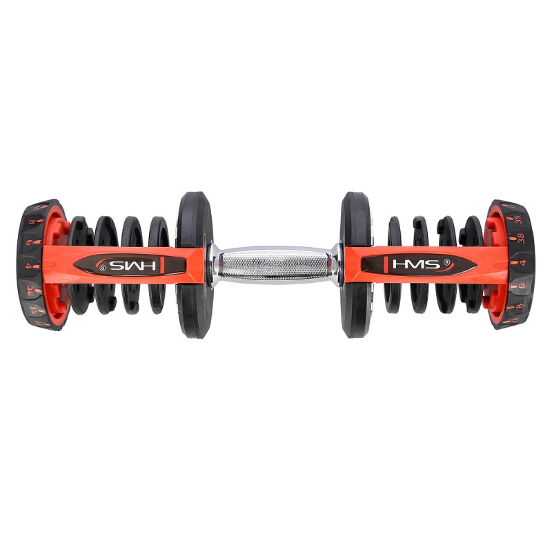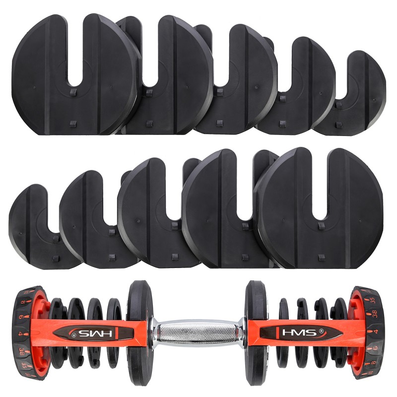 Регулируемият дъмбел HMS SR80 се състои от щанга, 10 диска с тежести и основа, този дъмбел ви позволява лесно и бързо да регулирате теглото според нуждите си.