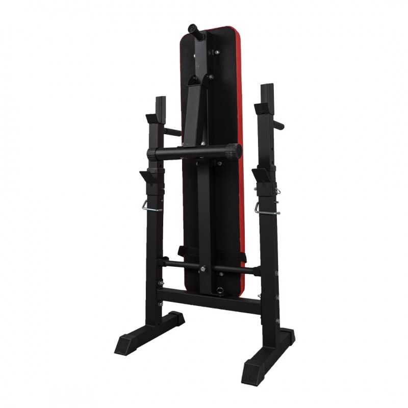Многофункционална пейка с регулируема на височина опора за бара. В допълнение към упражненията с щанга можете да правите и упражнения с успоредни дръжки (благодарение на дръжките на регулируемите опори за щанга).
